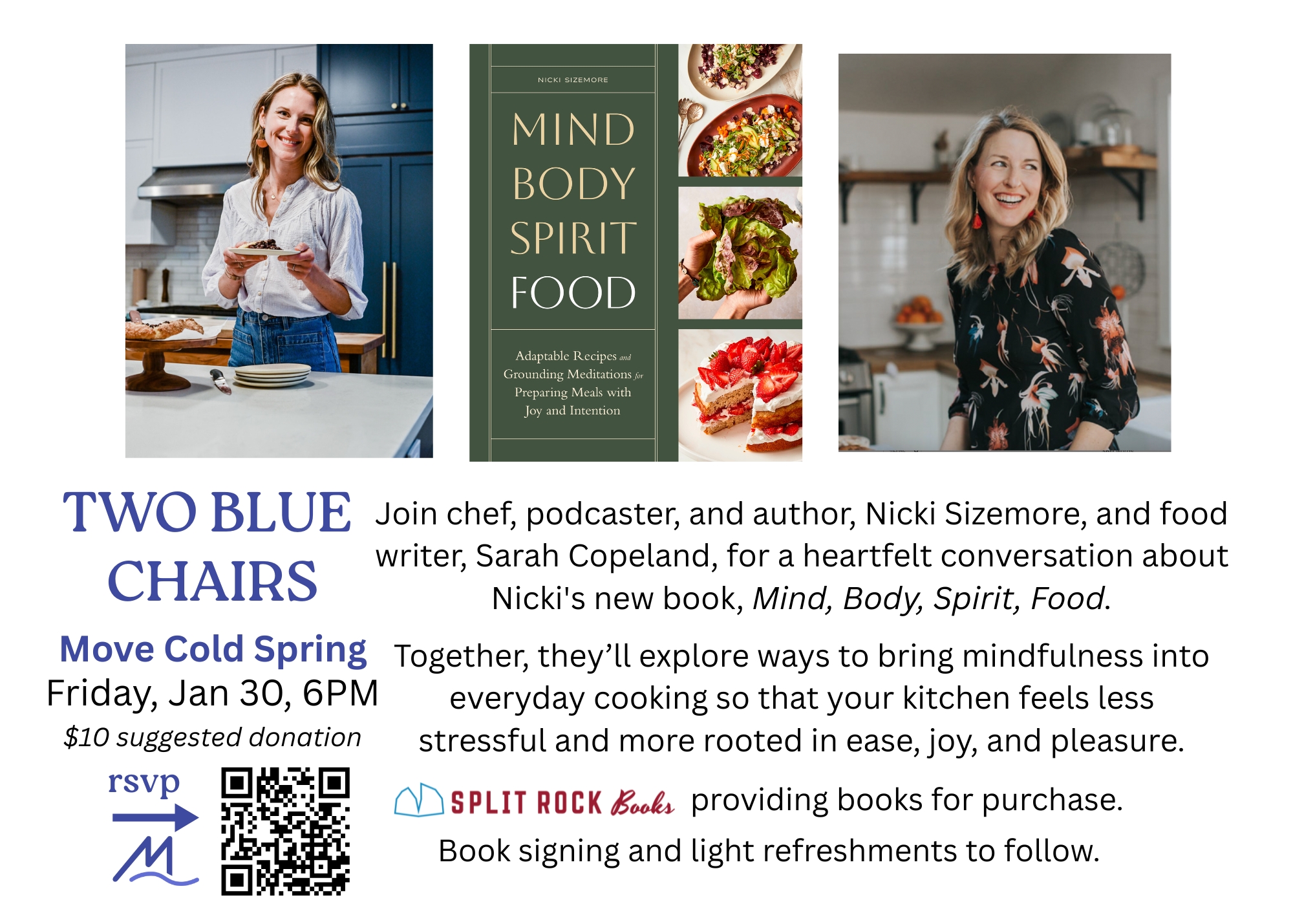 FRIDAY, JAN. 30, 6PM. Join Nicki Sizemore and Sarah Copeland for a heartfelt conversation about Nicki's new book, Mind Body Spirit Food. Book purchase and signing and light refreshments following event. Books available for purchase prior to event at Split Rock Books.